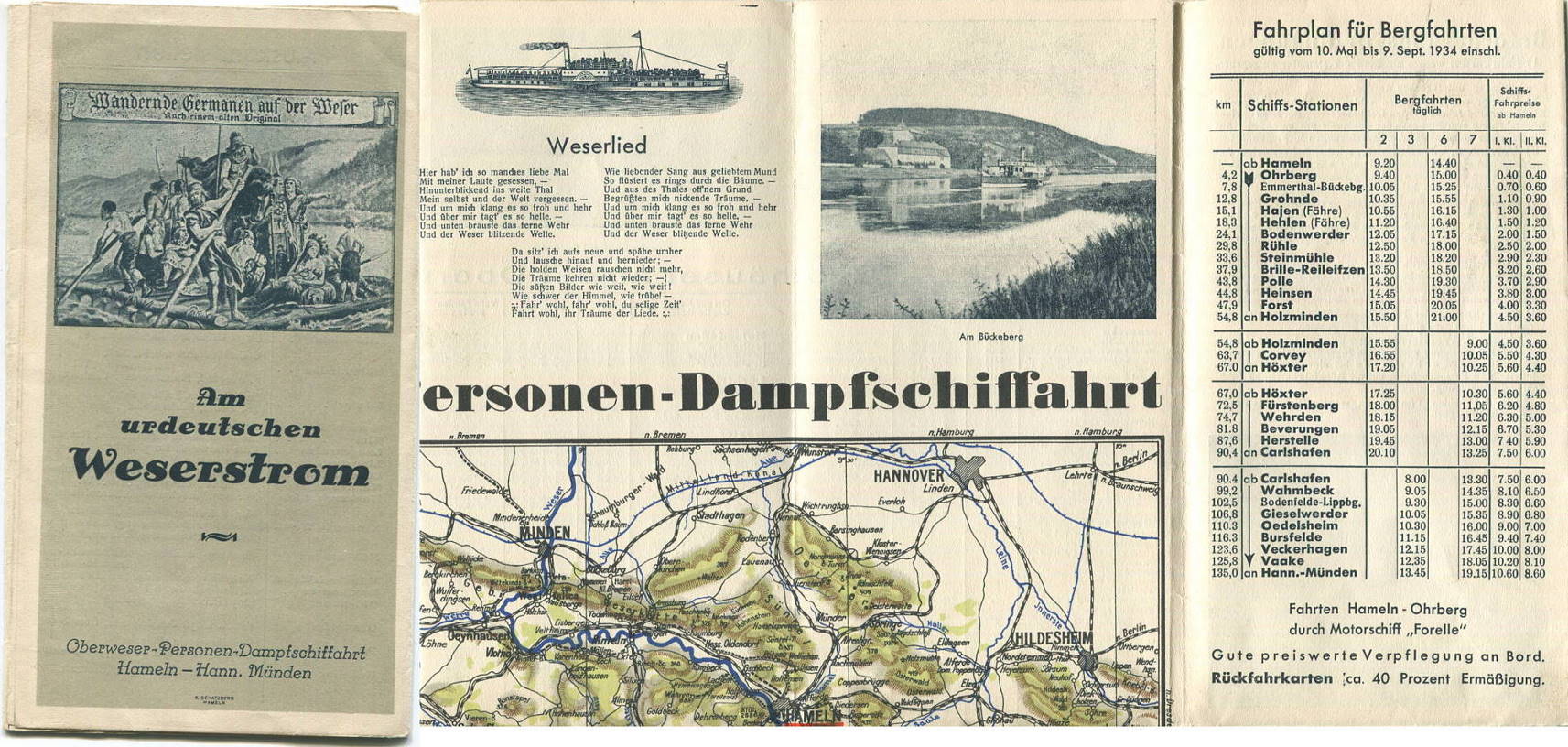 Am urdeutschen Weserstrom - Oberweser-Personen-Dampfschiffahrt Hameln Hann. Münden - Faltblatt mit 11 Abbildungen - Karte von Hameln und Umgebung - Fahrplan für Berg- und Talfahrten - Fahrpreistabelle 1934 - Gasthäuser an der Oberweser (EP2141y) |