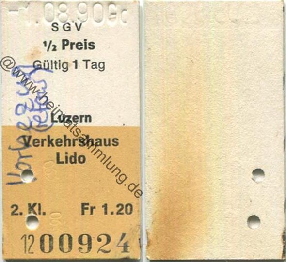 SGV Schifffahrtsgesellschaft des Vierwaldstättersees - Luzern Verkehrshaus Lido einfach - Fahrkarte 1/2 Preis 1990 - handschriftlich