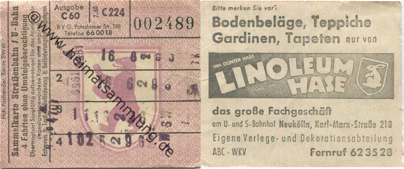 Berlin - BVG - Sammelkarte - Strassenbahn / U-Bahn 4 Fahrten ohne Umsteigeberechtigung 1958 - rückseitig Werbung Linoleum Hase (G14960y) |