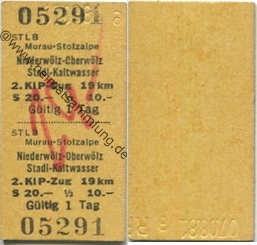 StLB Steiermärkische Landesbahnen - Stadl-Kaltwasser bis Murau-Stolzalpe - Fahrkarte 2. Kl 1973 (G55957y) |