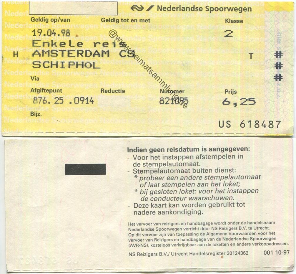 Einzelfahrkarte Amsterdam Hauptbahnhof Schiphol Niederländische Eisenbahn