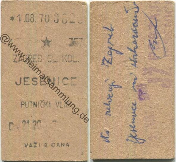 Jugoslawien - Zagreb (Kroatien) - Jesenice (Slowenien) - Fahrkarte 1970