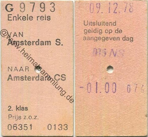 Enkele reis van Amsterdam S. naar Amsterdam CS - Fahrkarte 1978 (G63054y) |
