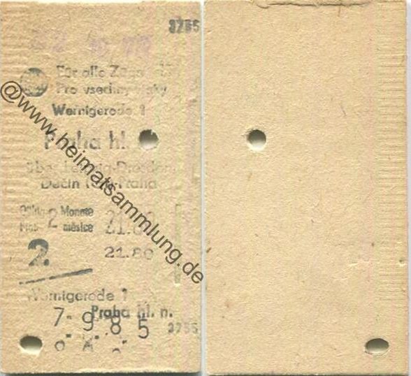 Wernigerode (DDR) - Praha hl. n. (Tschechien) - Fahrkarte 2. Kl. 1985 (G63045y) |