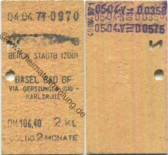 Berlin (Stadtbahn) (Zoo) Basel Bad BF via Gerstungen (GR) Karlsruhe - Fahrkarte 1977 (G63082y) |