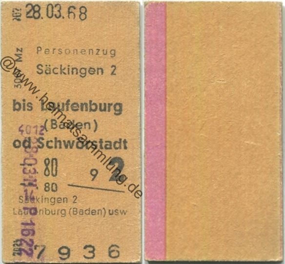 Säckingen bis Laufenburg (Baden) oder Schwörstadt - Fahrkarte 1968 (G63083y) |
