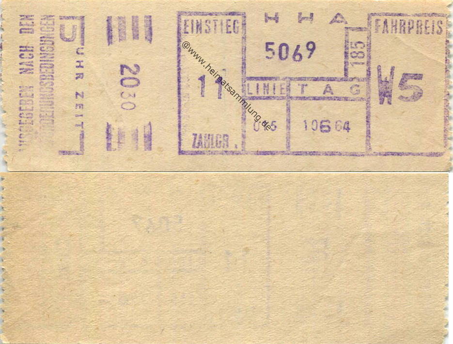 Hamburg - HHA - Hamburger Hochbahn AG - Linie 015 - Fahrpreis W5 - Fahrschein 1964 (G15165y) |