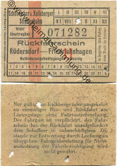 Schöneiche Kalkberge - Schöneicher und Kalkberger Strassenbahn - Rückfahrschein Rüdersdorf Friedrichshagen - Gebrauchsspuren (G59368y) |