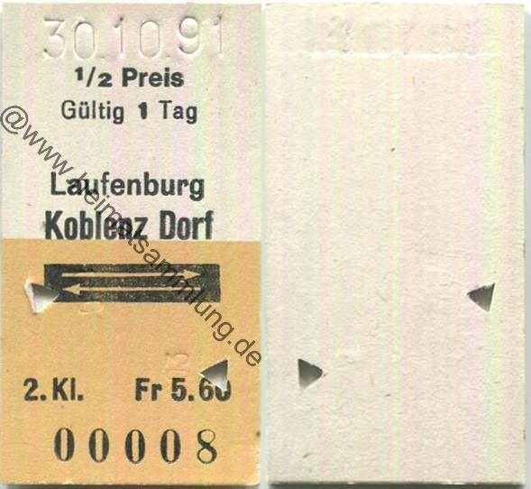 Laufenburg Koblenz Dorf retour - Fahrkarte 1991 1/2 Preis (G62844y) |