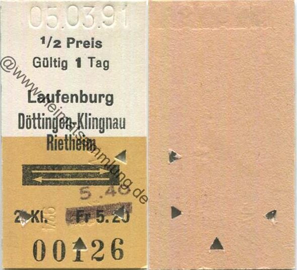 Laufenburg Döttingen-Klingnau Rietheim - Fahrkarte 1991 1/2 Preis -