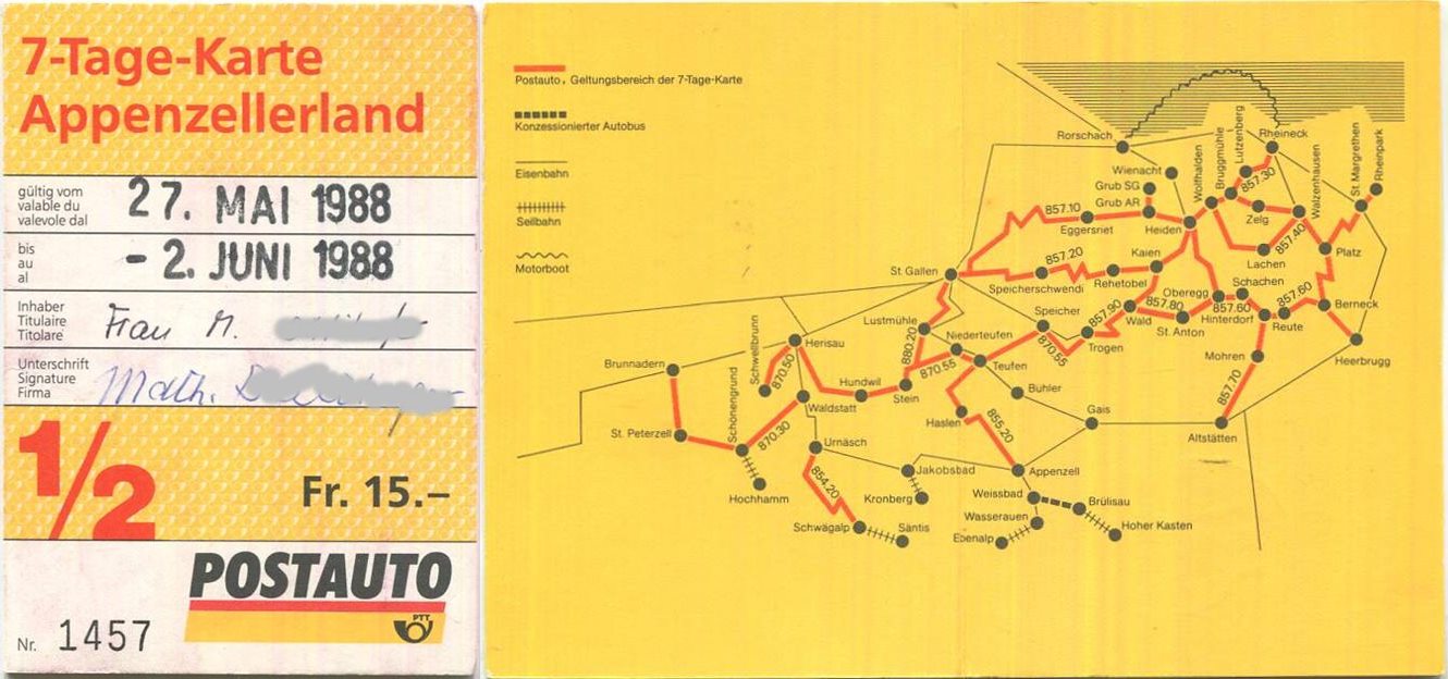 Postauto - 7-Tage-Karte Appenzellerland - Fahrkarte 1/2 Taxe 1988 (G62811y) |