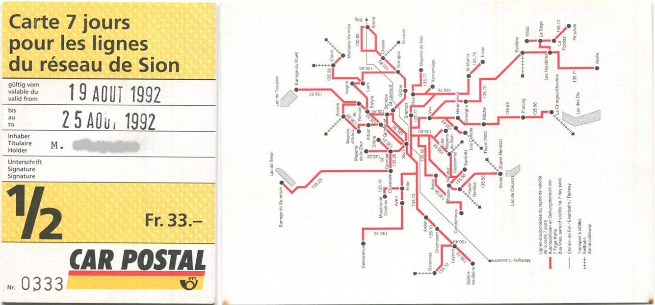 Car Postal - Postauto - 7-Tage-Karte pour les lignes du reseau de Sion - Fahrkarte 1/2 Taxe 19892 (G62812y) |