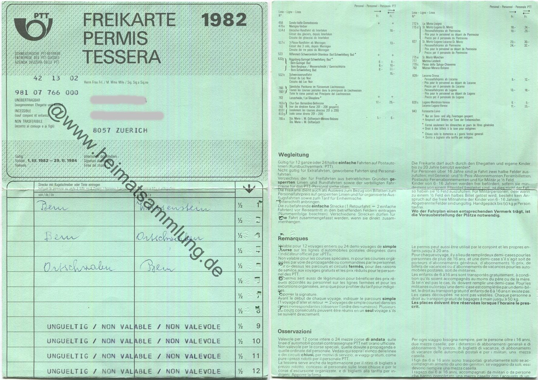 Schweizerische PTT-Betriebe - Freikarte 1982 - Gültig 2 Jahre (G62818y) |