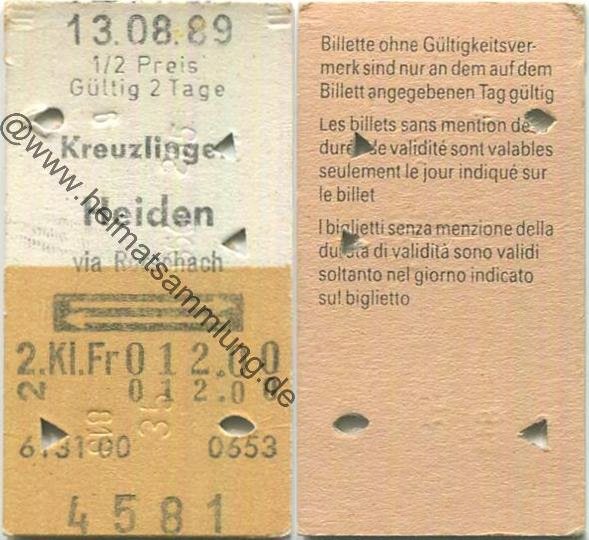 Kreuzlingen Heiden via Rorschach retour - Fahrkarte 1/2 Preis 1989 (G62863y) |
