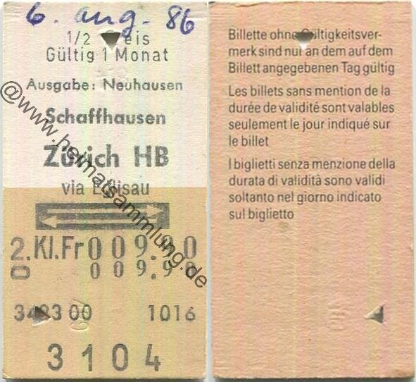 Schaffhausen Zürich HB via Eglisau retour - Ausgabe Neuhausen - Fahrkarte 1/2 Preis 1986 (G62864y) |