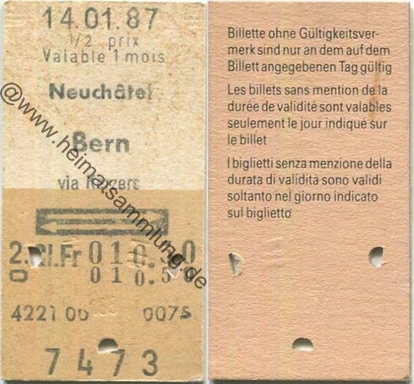 Neuchatel Bern via Kerzers retour - Fahrkarte 1/2 prix 1987 (G62865y) |