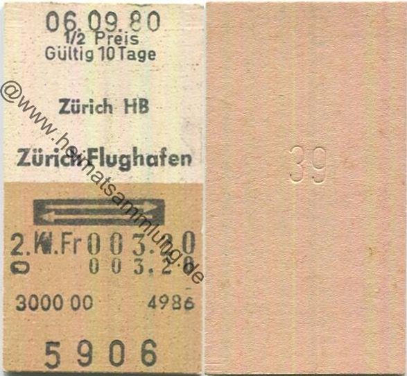 Zürich HB Zürich Flughafen retour - Fahrkarte 1/2 Preis 1980 (G62867y) |