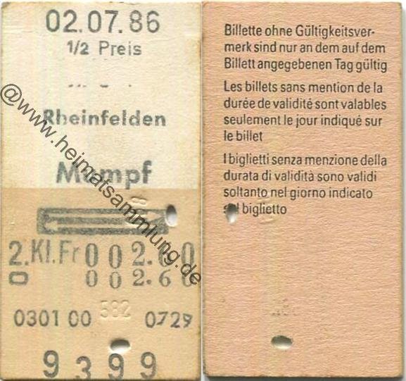 Rheinfelden - Mumpf und zurück - Fahrkarte 1986 (E62723y) |