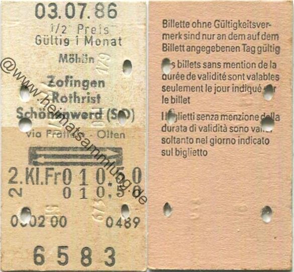 Möhlin Zofingen Rothrist Schönenwerd (SO) via Pratteln Olten retour - Fahrkarte 1/2 Preis 1986 (G62869y) |