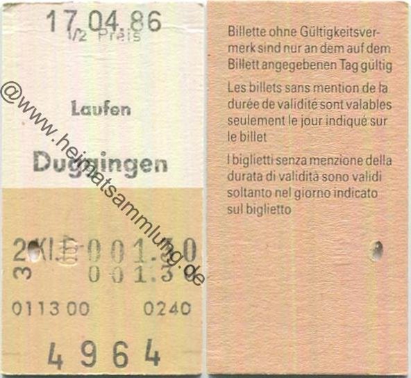 Laufen Duggingen einfach - Fahrkarte 1/2 Preis 1986 (G62870y) |