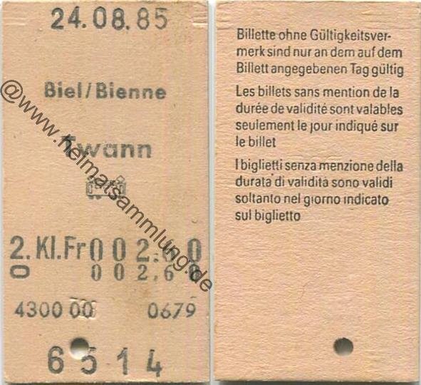Biel/Bienne Twann mit Bahn einfach - Fahrkarte 1985 (G62872y) |