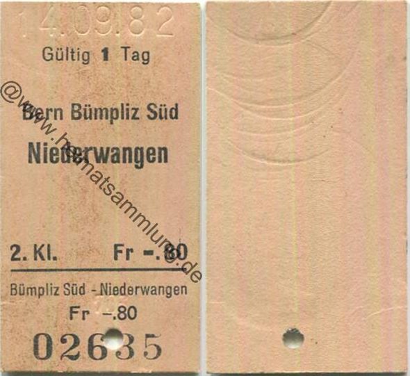 Bern Bümpliz Süd Niederwangen einfach - Fahrkarte 1982 (G62873y) |