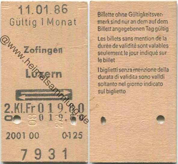 Zofingen Luzern retour - Fahrkarte 1986 (G62878y) |