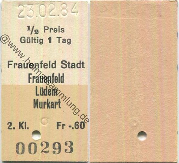 Frauenfeld Stadt Frauenfeld Lüdem Murkart einfach - Fahrkarte 1/2 Preis