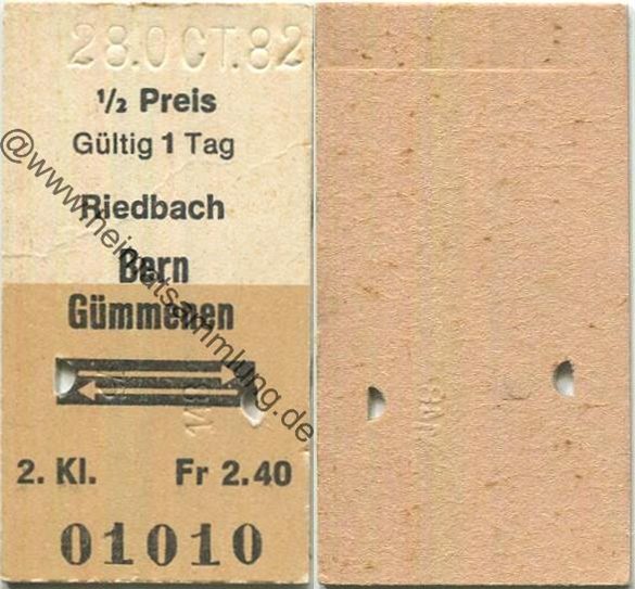Riedbach Bern Gümmenen retour - Fahrkarte 1/2 Preis 1982 (G62880y) |