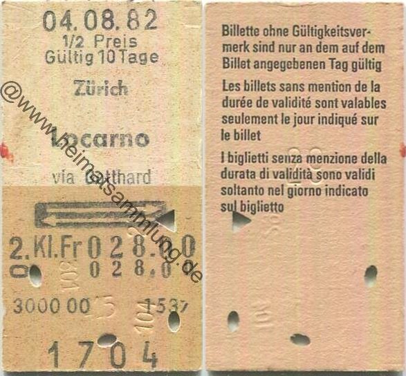 Zürich Locarno via Gotthard retour - Fahrkarte 1/2 Preis 1982 (G62882y) |