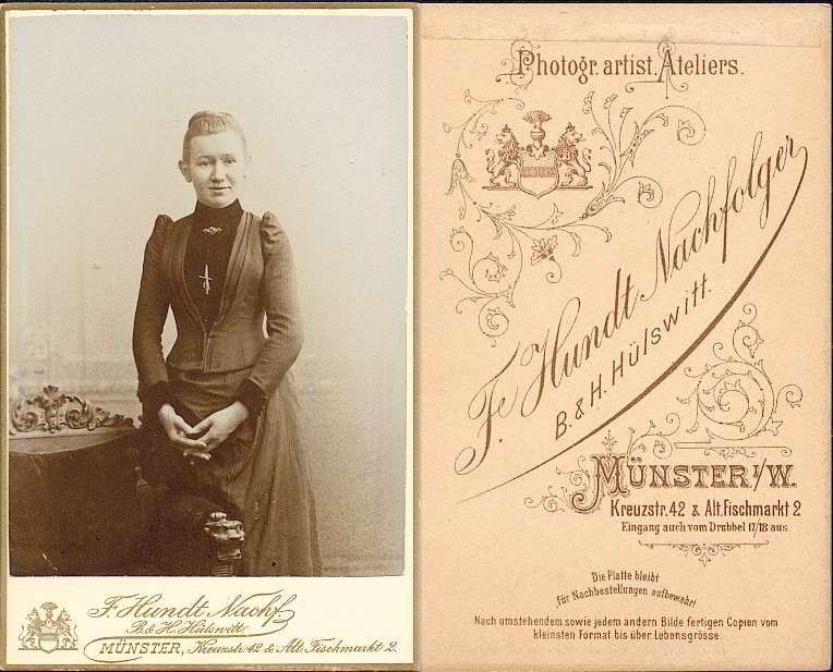 Kabinettfoto - Junge Frau - Atelier F. Hundt Nachf. B. & H. Hülswitt Münster Kreuzstrasse 42 & Alter Fischmarkt 2 (E70950) |