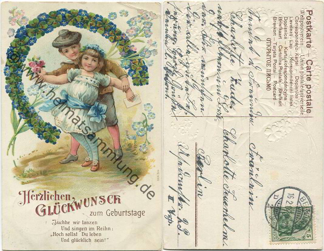 Geburtstag - tanzende Kinder - Glücksklee - Prägedruck - Eckknick oben rechts (E9415y) |