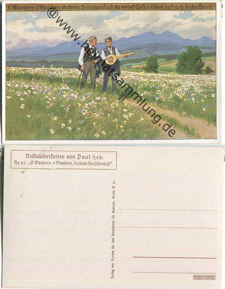 Paul Hey - Volksliederkarte Nr. 92 - O Wandern o Wandern du freie Burschenlust - Künstlerkarte 20er Jahre - Verlag Verein für das Deutschtum im Ausland Berlin (G45373y) |