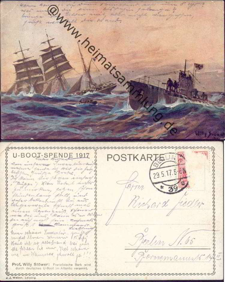 Künstlerkarte Willy Stöwer - Französische Bark wird durch deutsches U-Boot im Atlantic versenkt - U-Boot-Spende 1917 - Verlag J. J. Weber Leipzig - Ecken geknickt (G1566y) |