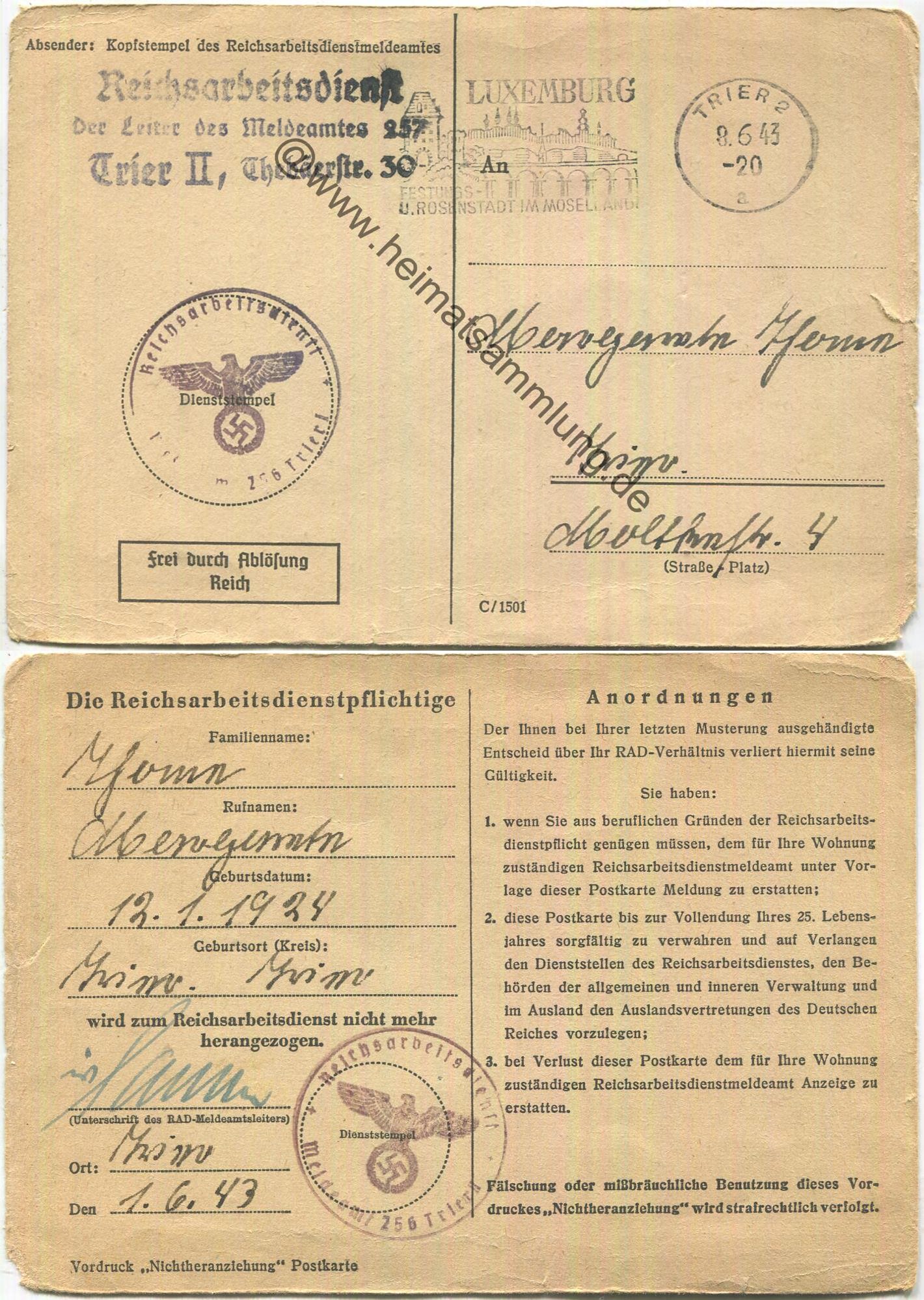 Reichsarbeitsdienst Trier - Die Reichsarbeitsdienstpflichtige ... wird zum Reichsarbeitsdienst nicht mehr herangezogen 1943 (G62761y) |
