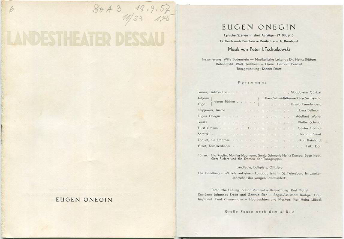 Landestheater Dessau - Spielzeit 1957/58 Nummer 4 - Eugen Onegin von Peter Tschaikowski - Magdalena Güntzel - Ursula Freudenberg - Erna Bellmann - Gebrauchsspuren - Heftklammer rostig (EP5309y) |