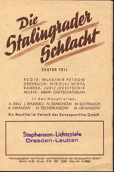Die Stalingrader Schlacht 1. Teil mit A. Dikij J. Shumskij u. v. a. - Faltblatt - Stephenson-Lichtspiele Dresden-Leuben (EP1787) |