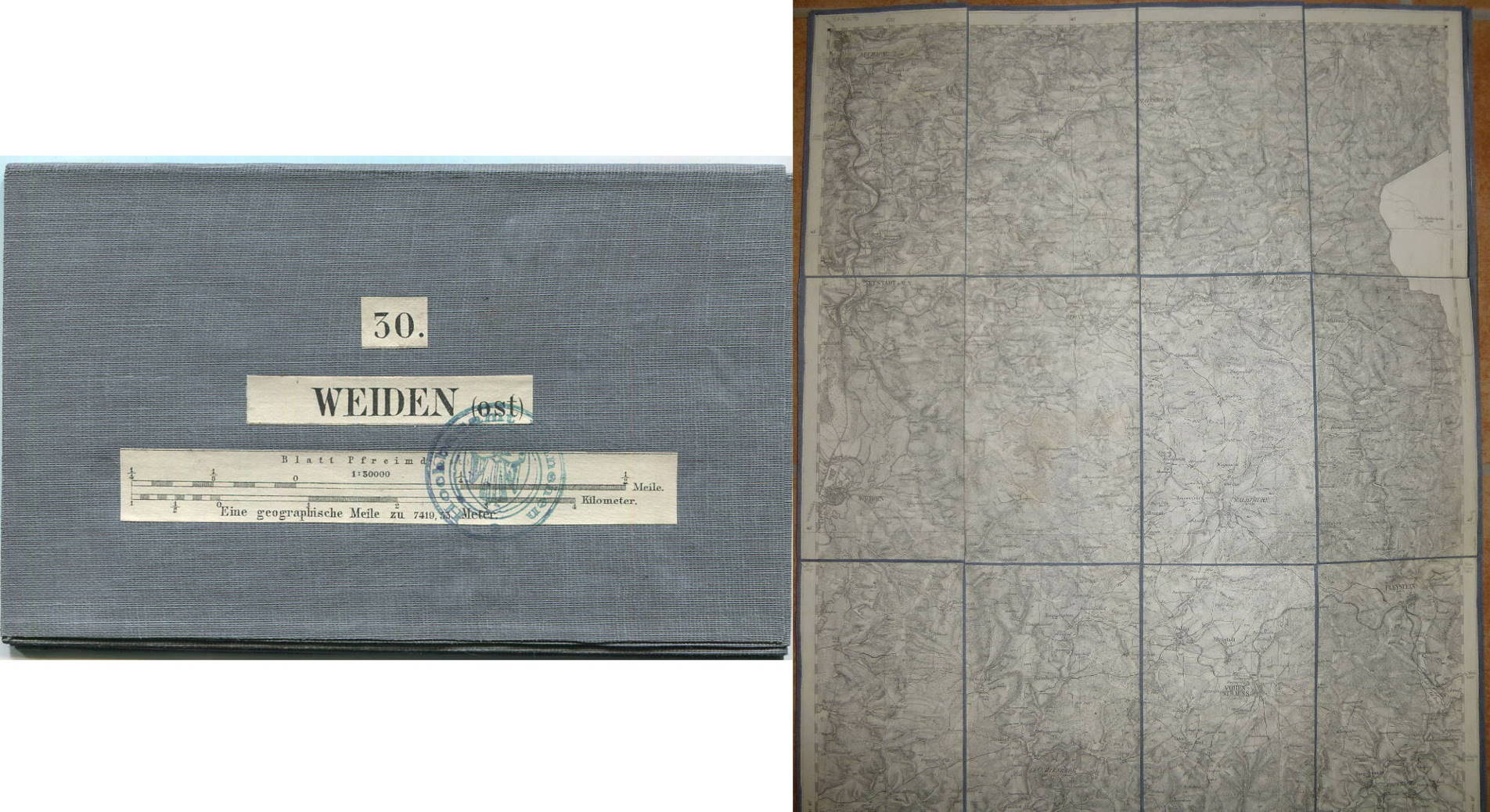 30 Weiden Ost - Topographische Karte von Bayern ( Bayerische Generalstabskarte) 1:50'000 43cm x 52cm auf Leinen gezogen - Stempel: Hochbauamt München ca. 1900 (EP8350y) |