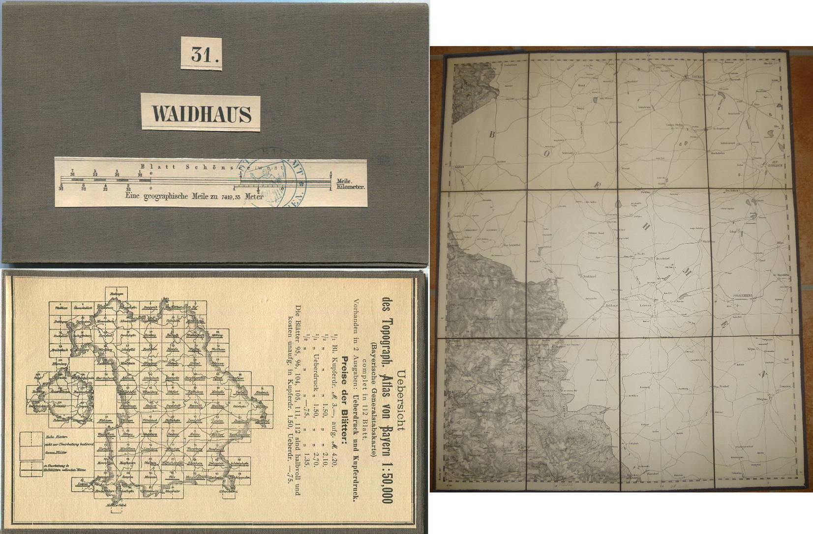 31 Weidhaus - Topographische Karte von Bayern ( Bayerische Generalstabskarte) 1:50'000 43cm x 52cm auf Leinen gezogen - Stempel: Bauamt Stadt München ca. 1900 (EP8352y) |