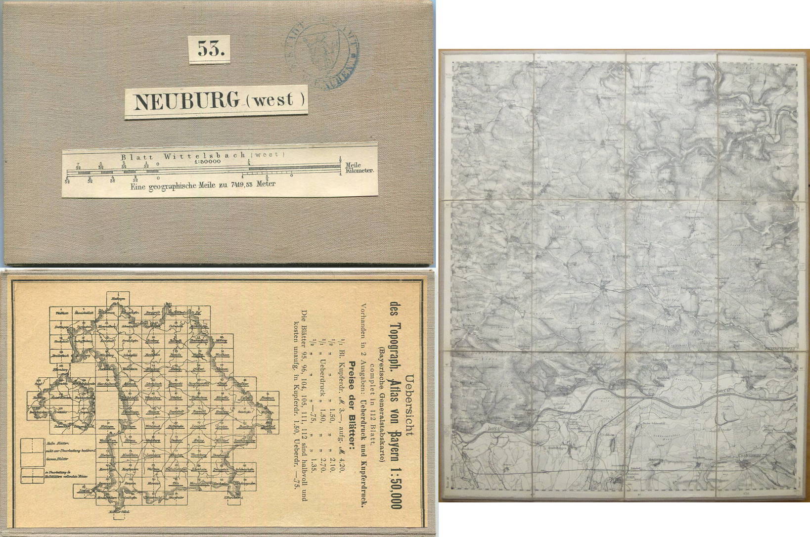 53 Neuburg West - Topographische Karte von Bayern ( Bayerische Generalstabskarte) 1:50'000 43cm x 52cm auf Leinen gezogen - Stempel: Bauamt Stadt München ca. 1900 (EP8366y) |