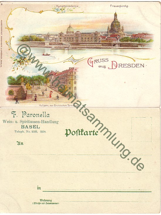 Dresden - Kunstakademie - Frauenkirche - F. Paronella Wein- und Spirituosen-Handlung Basel - Verlag Finkenrath & Gransick Berlin - leichte Gebrauchsspuren (E46575) |