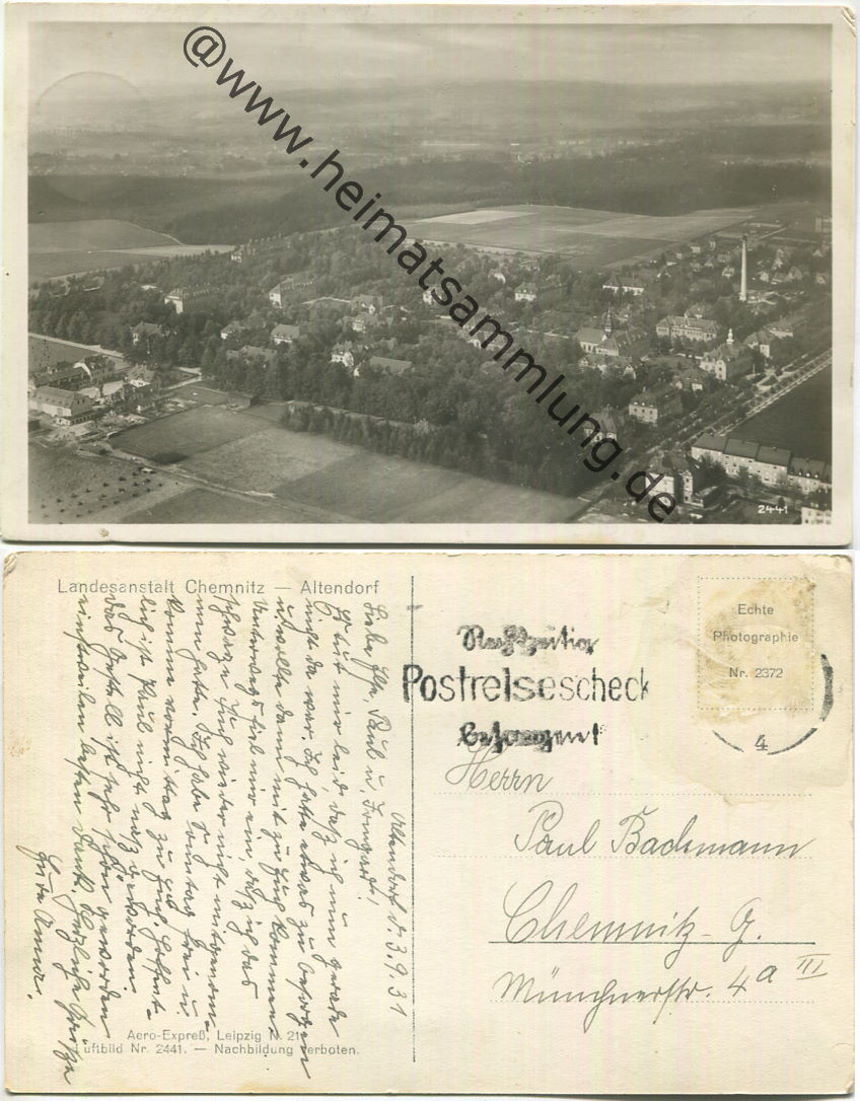 Chemnitz - Altendorf - Landesanstalt - Foto-AK - Fliegeraufnahme - Verlag Aero-Express Leipzig - Briefmarke entfernt - Gebrauchsspuren (E31811y) |
