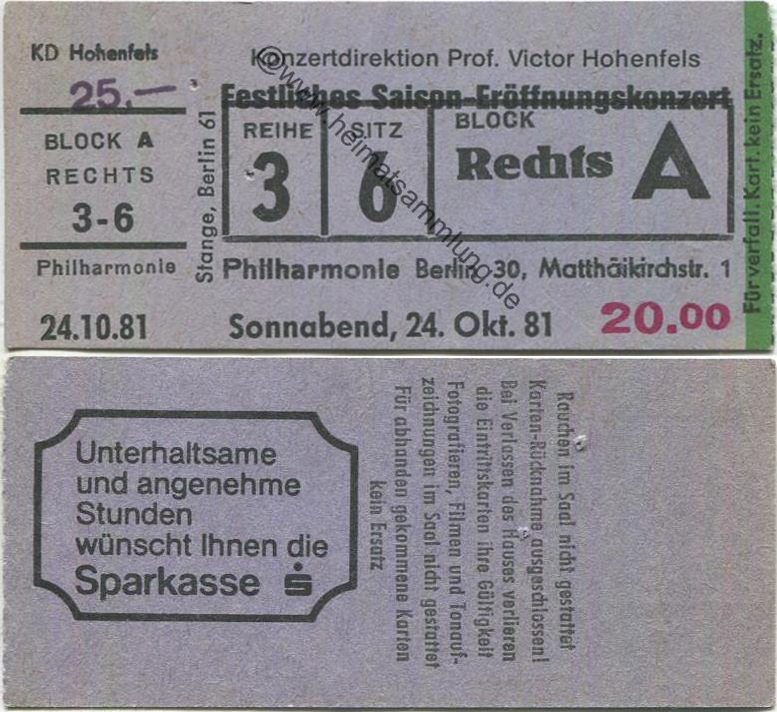 Berlin - Philharmonie - Saison Eröffnungskonzert 1981 - Eintrittskarte (G62737y) |