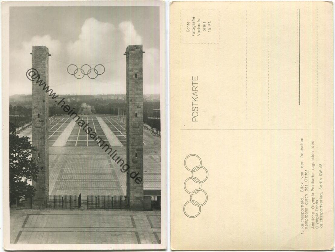 Berlin - Reichssportfeld - Blick von der Deutschen Kampfbahn durch das Osttor 1936 - Foto-AK - Amtliche Olympiapostkarte (E35148y) |