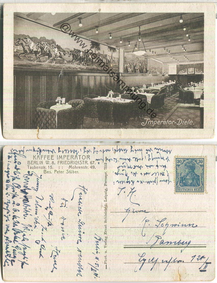 Berlin-Mitte - Imperator-Diele - Kaffee - Friedrichsstrasse 67 - Besitzer Peter Stüber - Verlag Ernst Schleicher Leipzig - Rückseite beschrieben 1921 - starke Gebrauchsspuren - Einriss unten links (E86324y) |