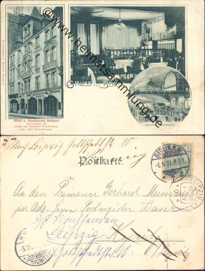 Gruss aus Berlin - Hotel und Restaurant Brüssel Georgenstrasse 29 direkt am Bahnhof Friedrichstrasse - Inhaber Carl Zimmermann - Verlag J. Miesler Berlin (G14468y) |