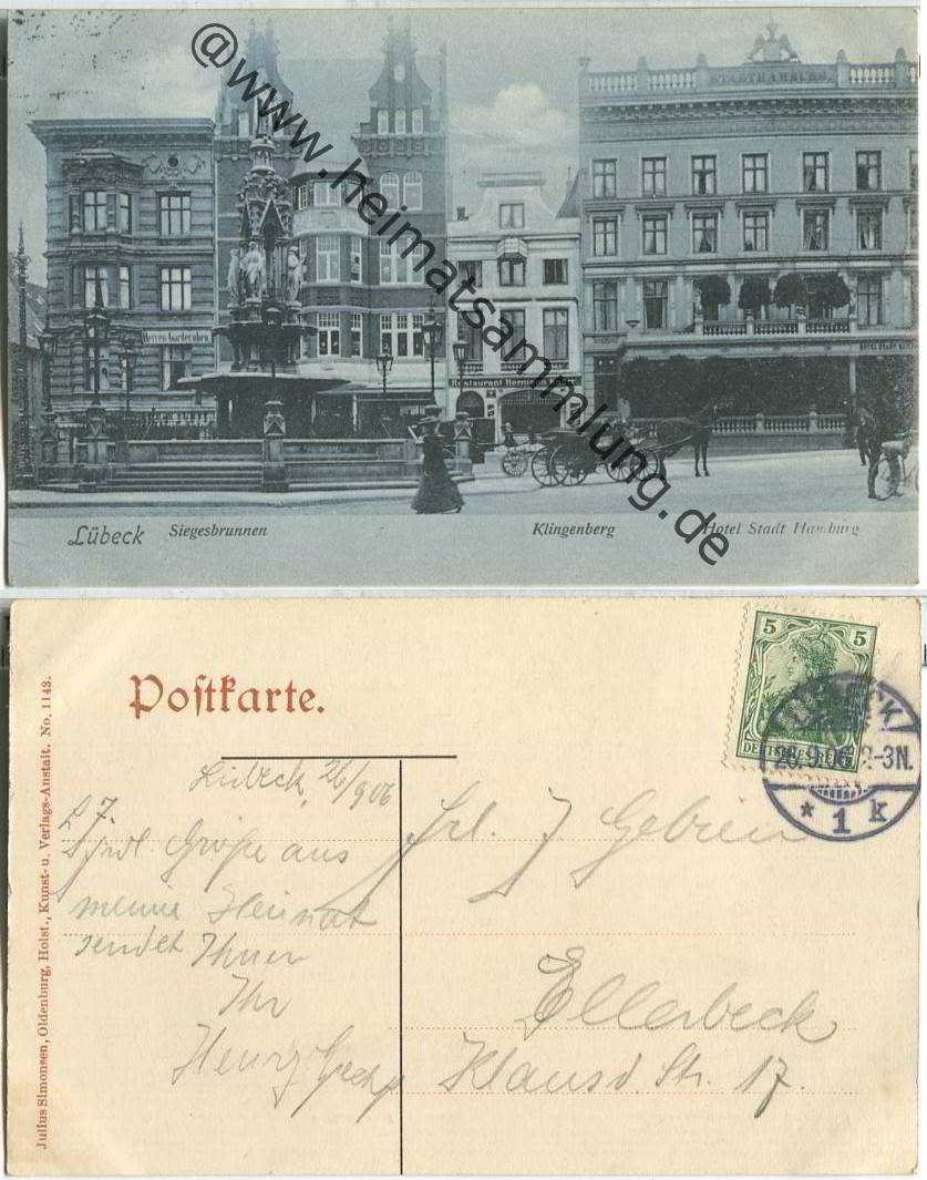 Lübeck - Siegesbrunnen - Klingenberg - Hotel Stadt Hamburg - Verlag Julius Simonsen Oldenburg (G32149y) |