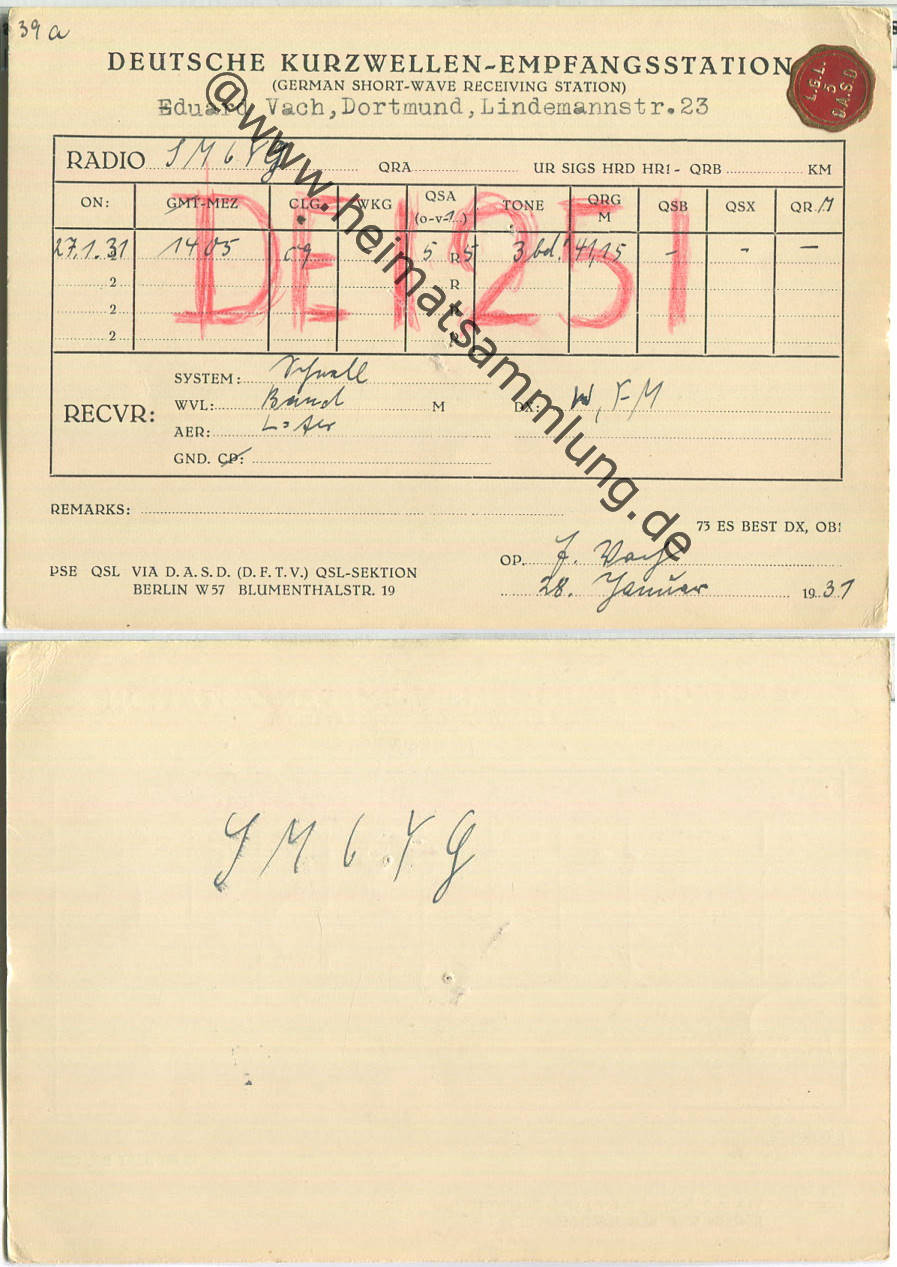 QSL - QTH - Funkkarte - DE1251 - Dortmund - 1931 - Nadellöcher mittig (G43146y) |