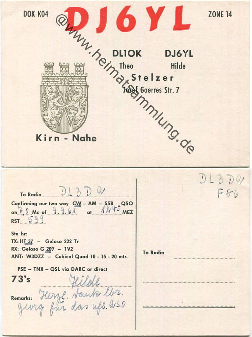 QSL - Funkkarte -DJ6YL - Kirn - 1961 (E25950y) |