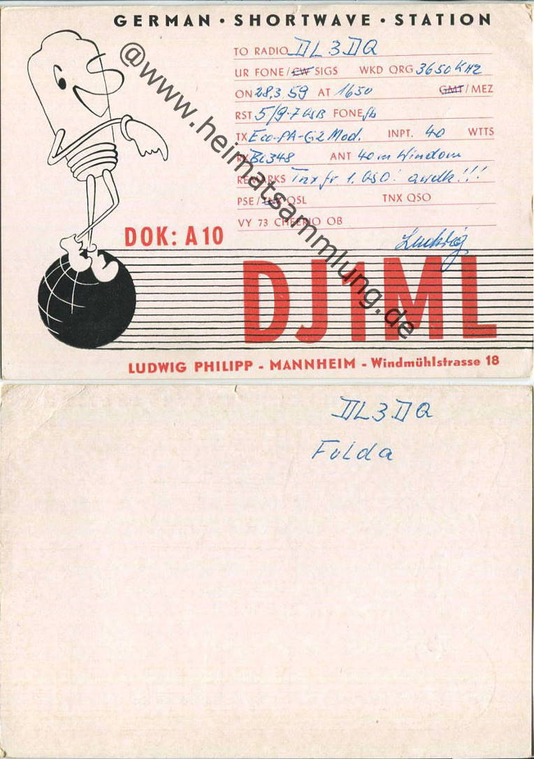 QSL - Funkkarte - DJ1ML - Mannheim - 1959 (E25815y) |